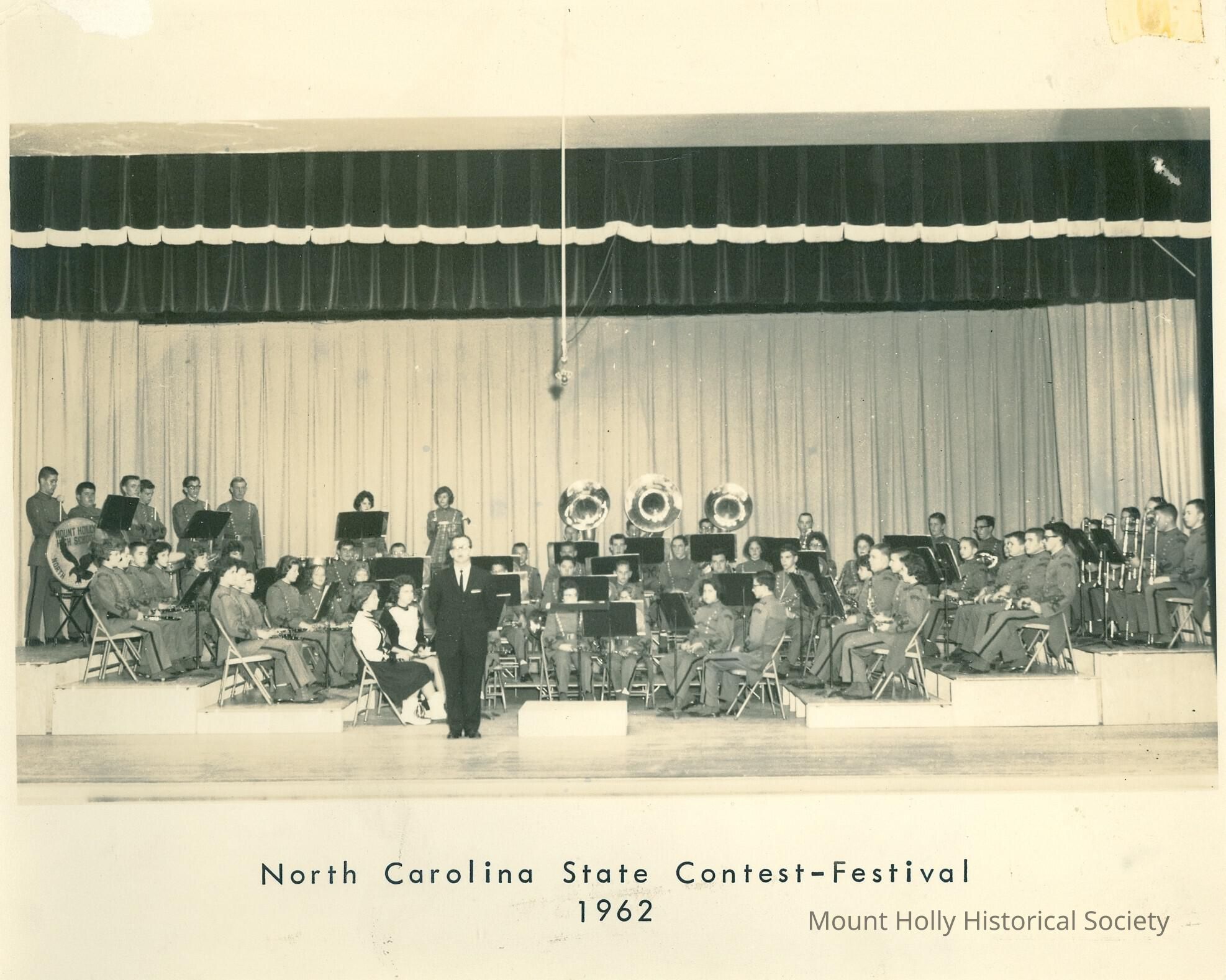 Band members in Confederate uniforms seated on chairs on wooden risers at NC State Contest-Festival