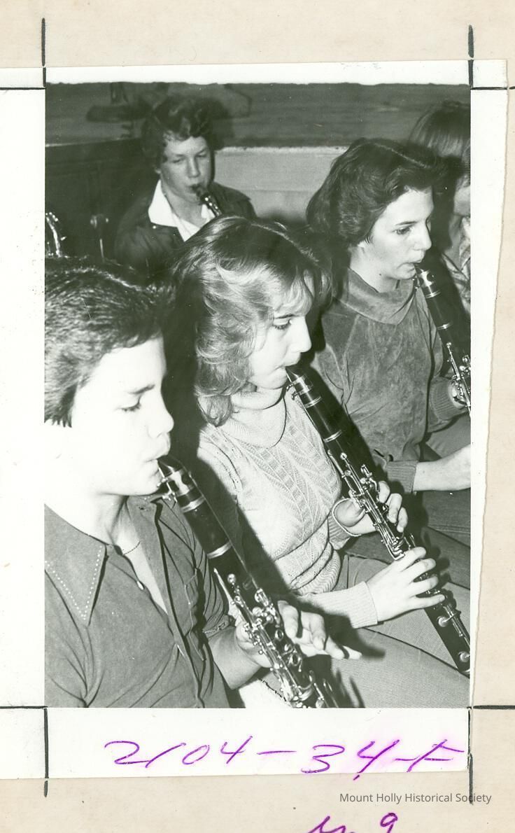 Close-up view of clarinet section from Mt. Holly Junior High band; three students playing (perhaps in rehearsal)