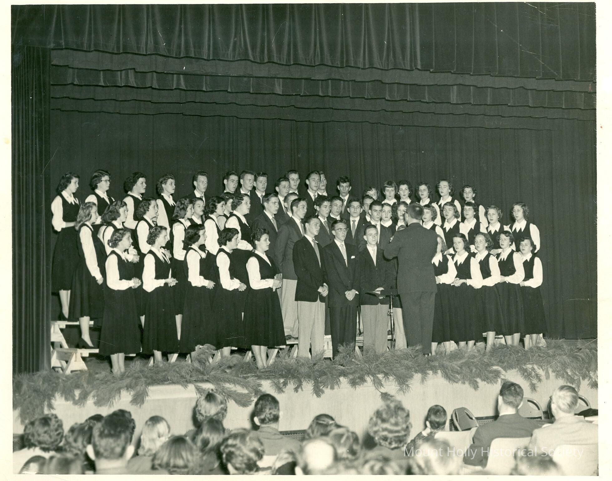 Mr. Black leading mixed chorus on stage decorated with greenery, with audience observing: Seth Kirby, David Morgan, Kathleen Preslar, Yvonne McCully, Earl Hall, Warren Duncan, Roland Bynum, Laney Funderburk, Gina Cline, Barbara Jean Andrews, Lanette Penn