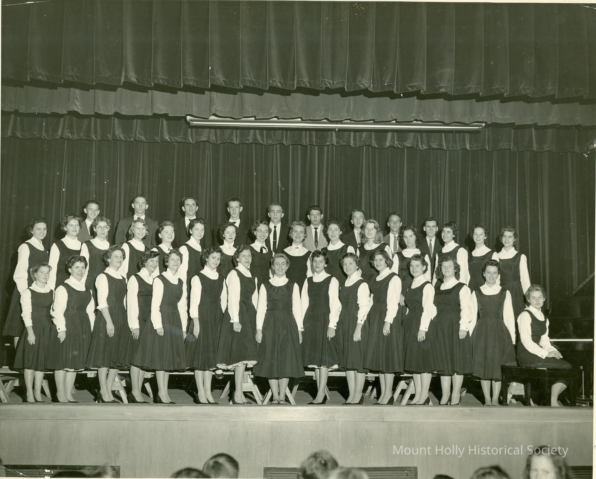 Photo of mixed chorus on stage in front of audience, with women in dresses, men in suits and ties, and pianist at right