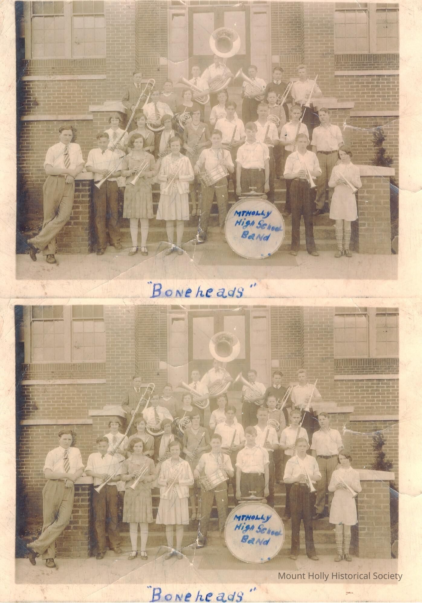 Two duplicate photos of Mt. Holly High School band, posed with instruments on steps, with "Boneheads" written thereon