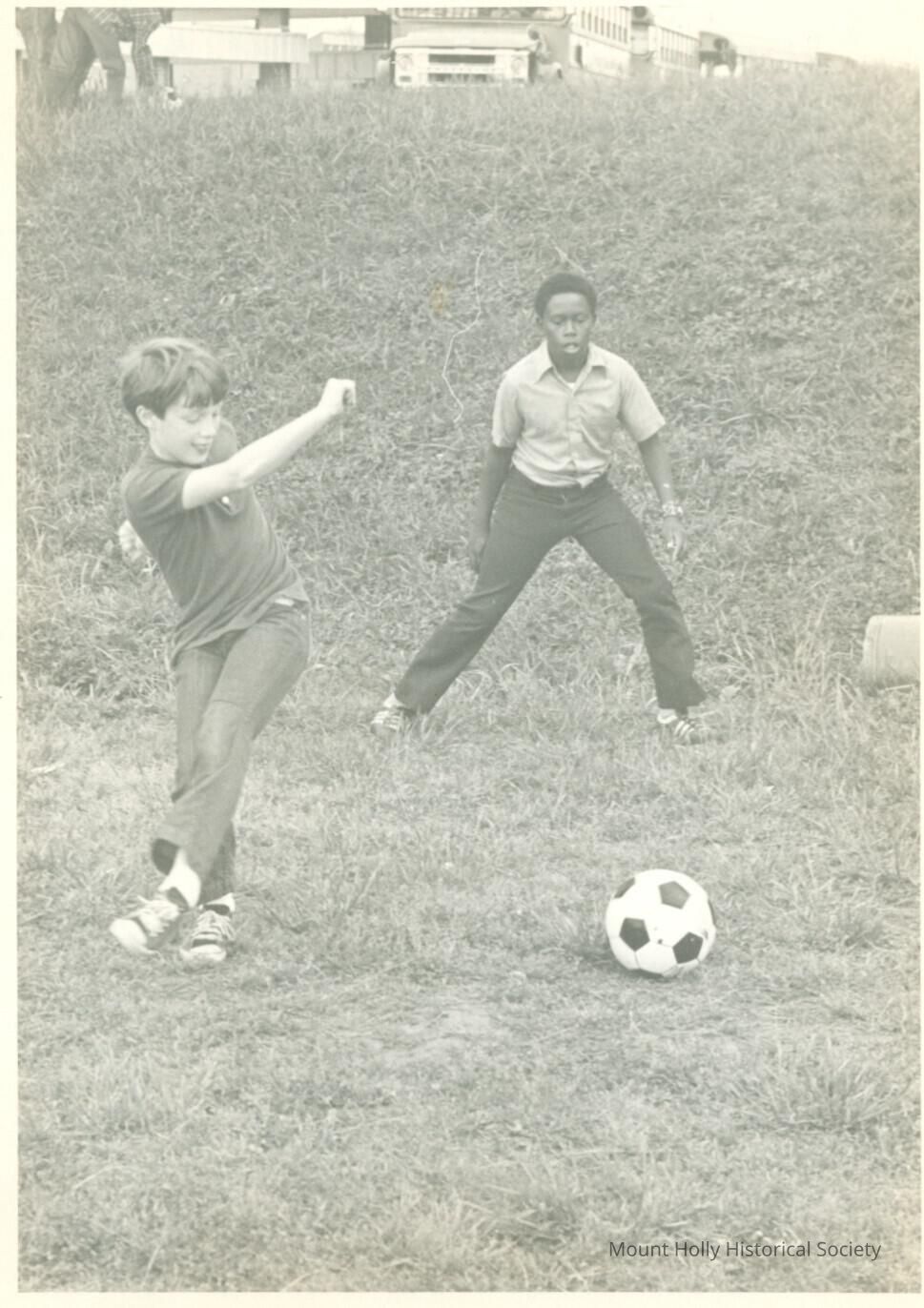 Joey Huffstetler and Kelvin Johnson playing soccer at Rankin Elementary School (photo by Bob Breiner)