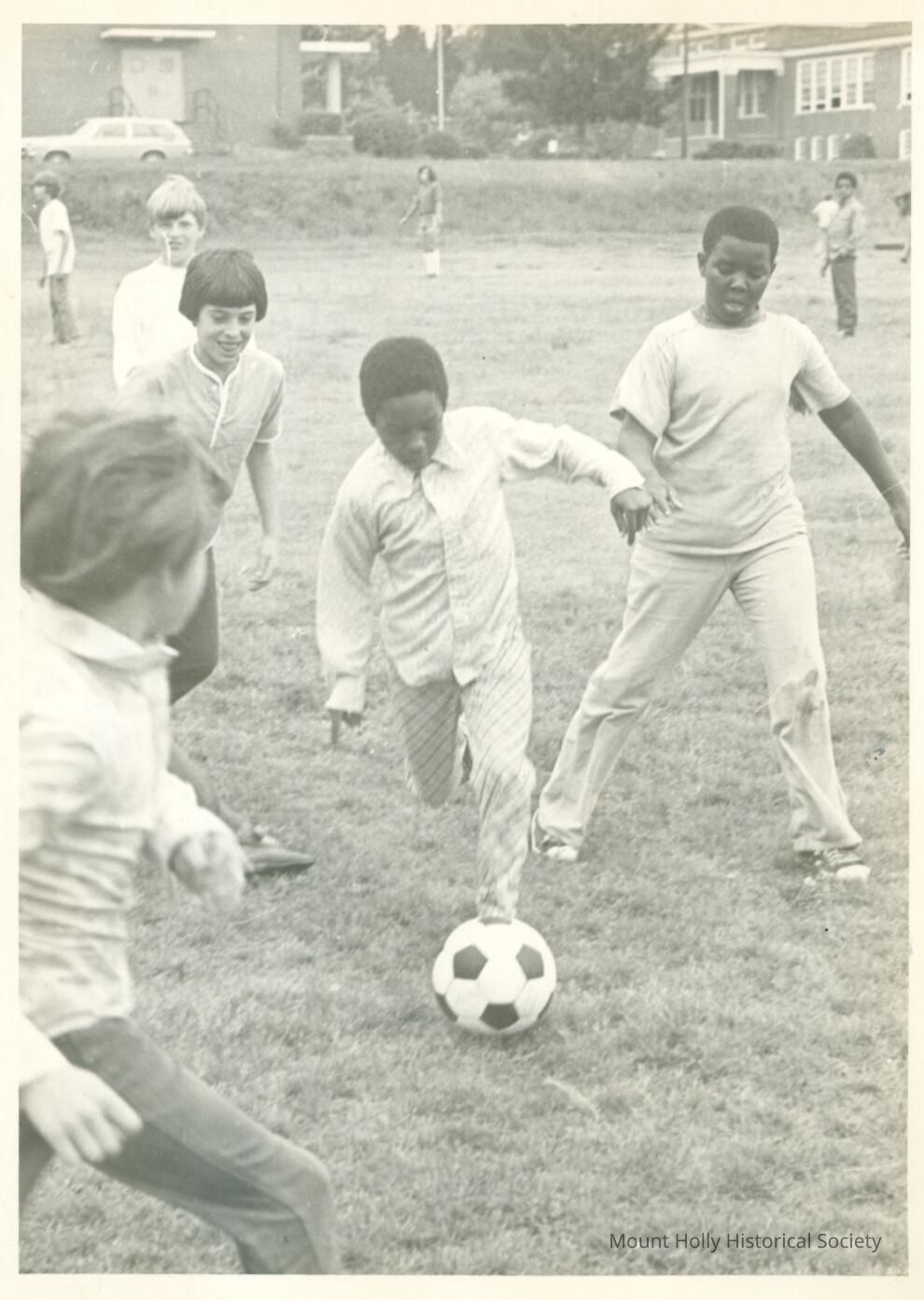 Dribbling down field is Billy Reed. L + R: Greg Fullam, Jeff Pressley, Tim Belk, Chris McLean. Background, L to R: Tim Starnes, Eddie Mancheno of the Belmont Abbey soccer team, Dwayne Currence. Photo by Bob Breiner.