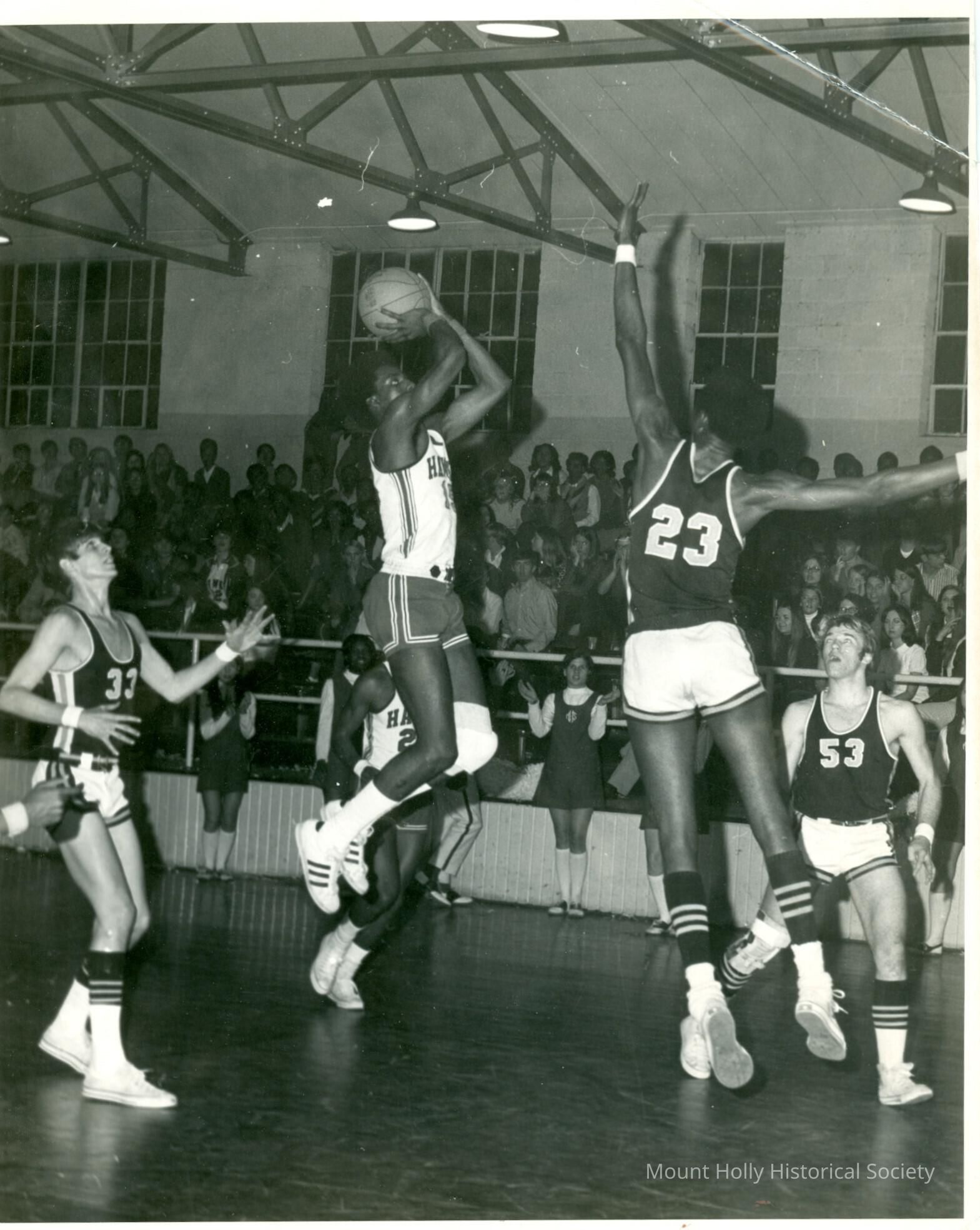 Basketball game: Mt. Holly Hawks player shoots ball while spectators watch