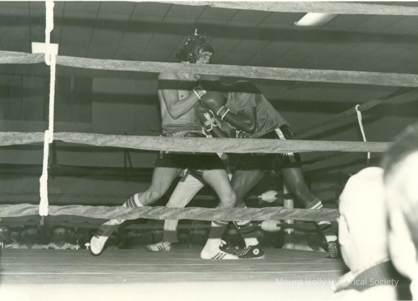 Two young men boxing in ring; "Fast and Furious" Golden Gloves, by Richard Flowers (from back of photo)