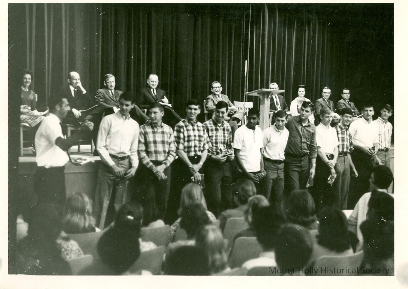 Awards Day: Group of young men lined up before stage in audience, with older men seated on stage and people in audience
