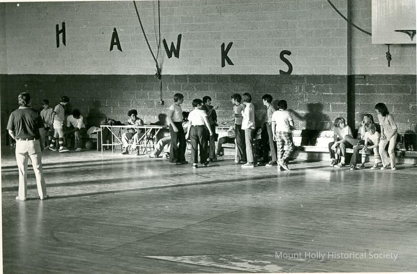 "Strategy Sessions": Group of seven boys discussing something as they stand by wall in gym; other students are in other groups