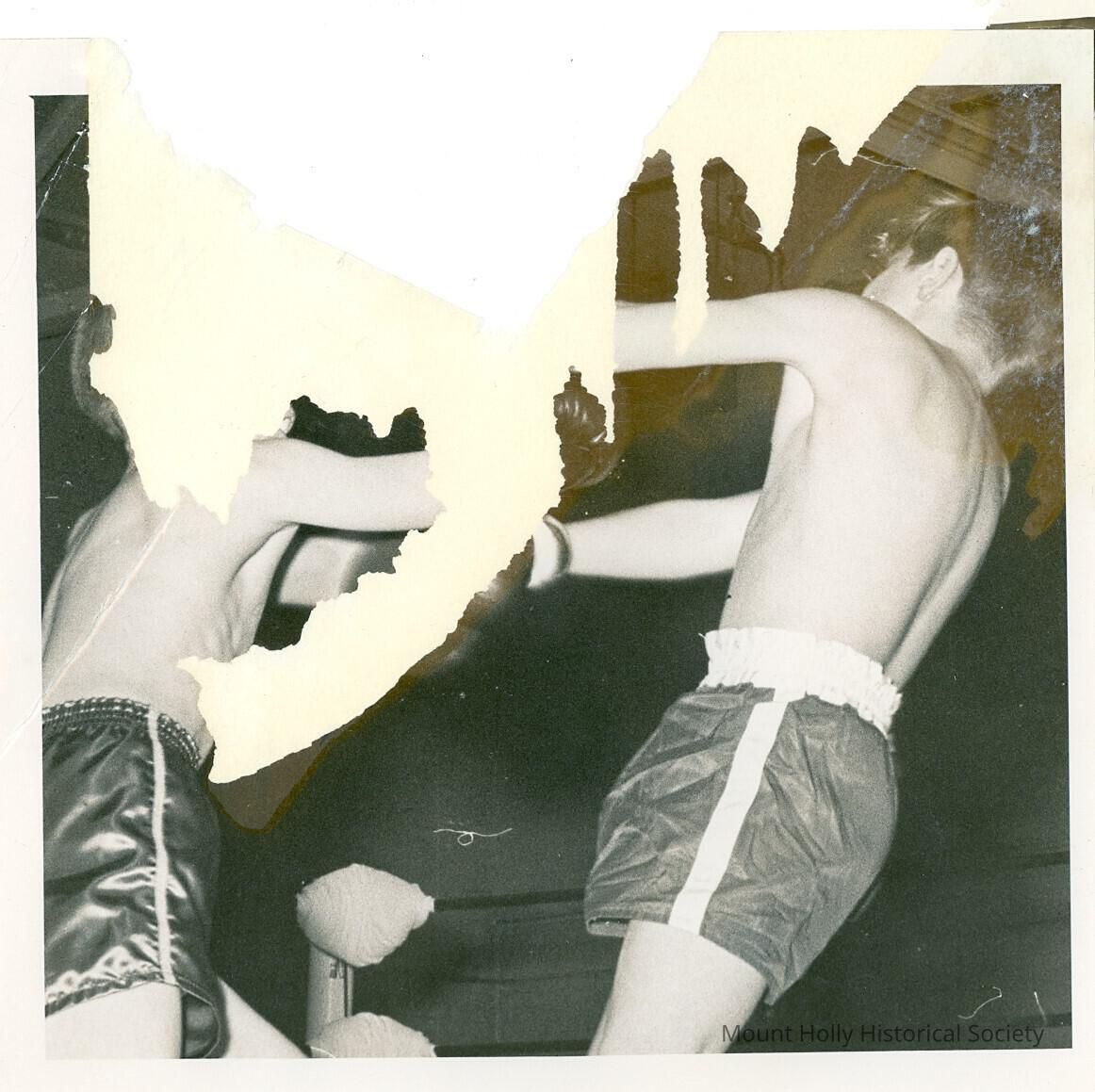 Badly damaged photography of two boxers sparring in ring