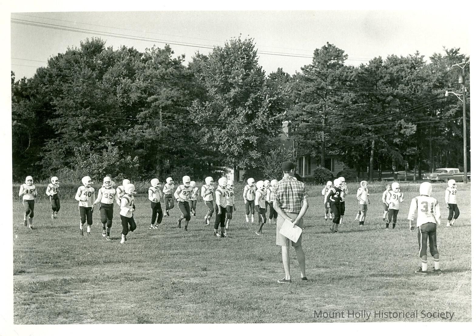 Football team practicing on field while coach (with back to viewer) observes