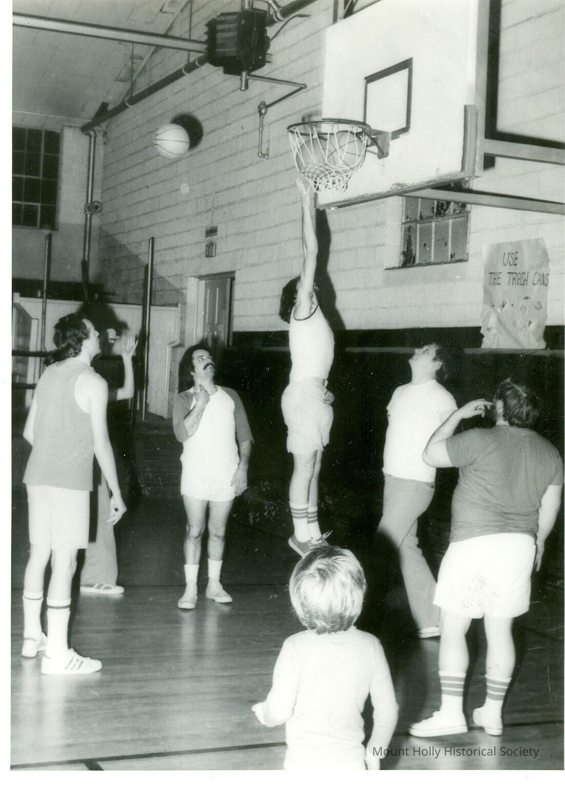 One basketball player leaps up to the net (which has two balls in it) while five others stand around; on the photo's back is written "Benefit Cage Game"