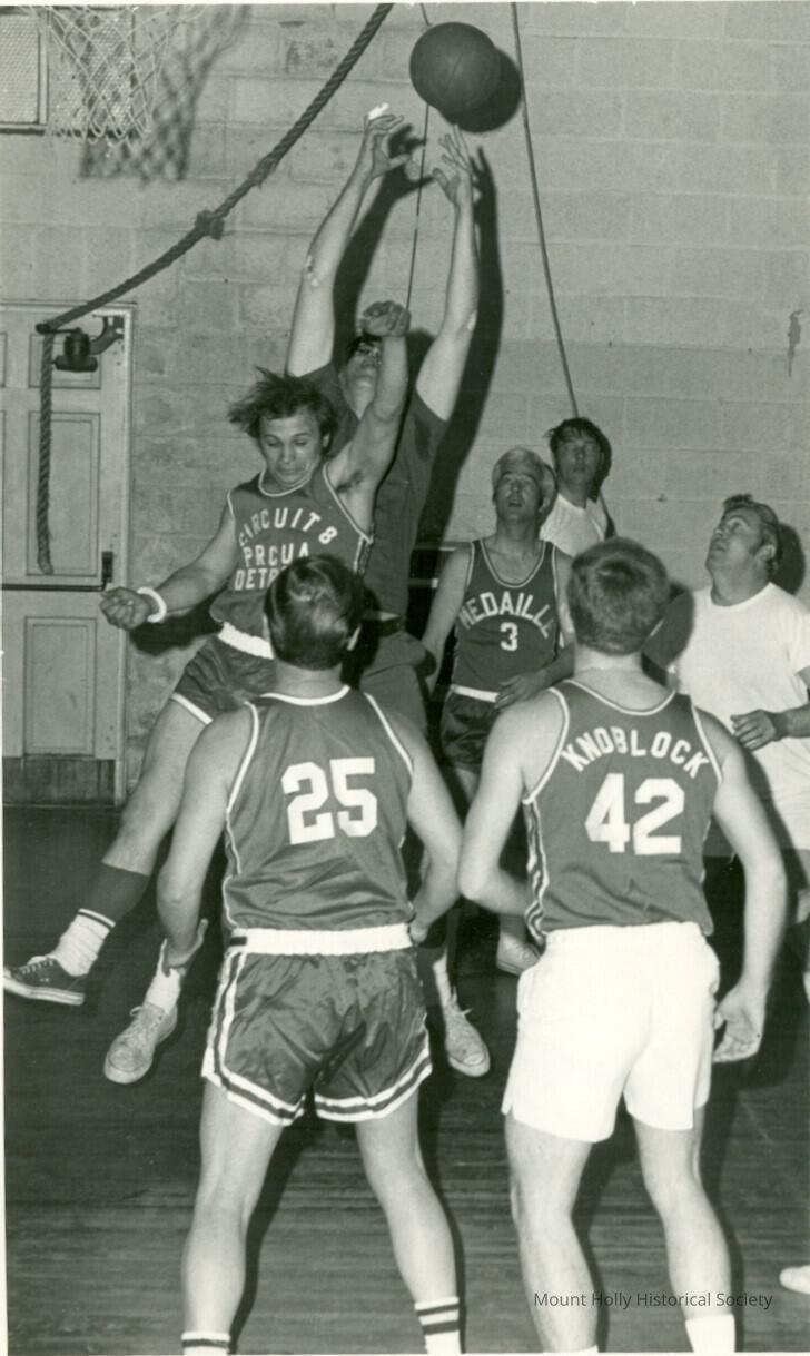 "Shades of 1963": Seven grown men playing basketball, with two leaping to catch ball while others look on