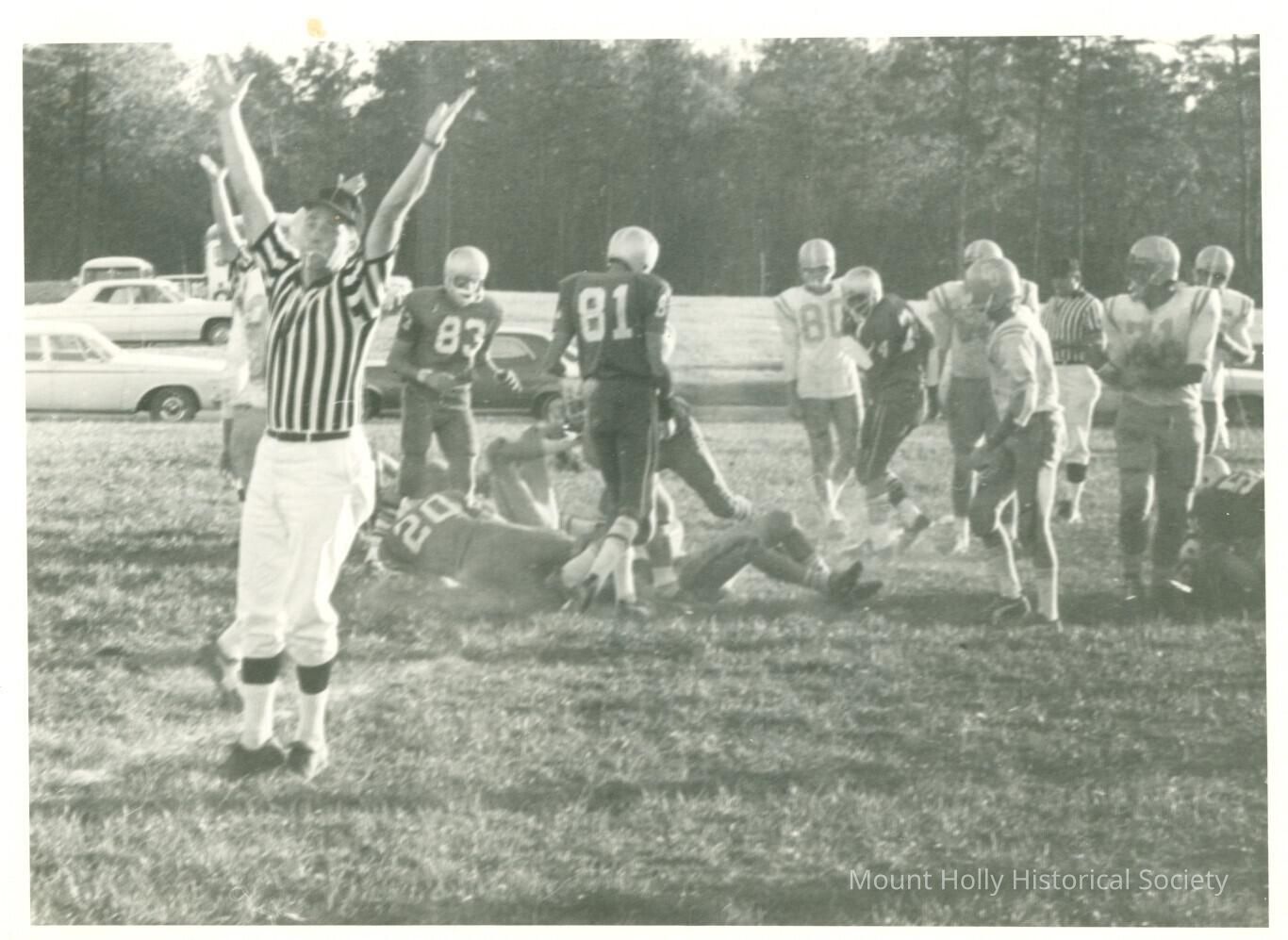 Referee holds hands up and blows whistle as football players stand behind him (three on the ground)
