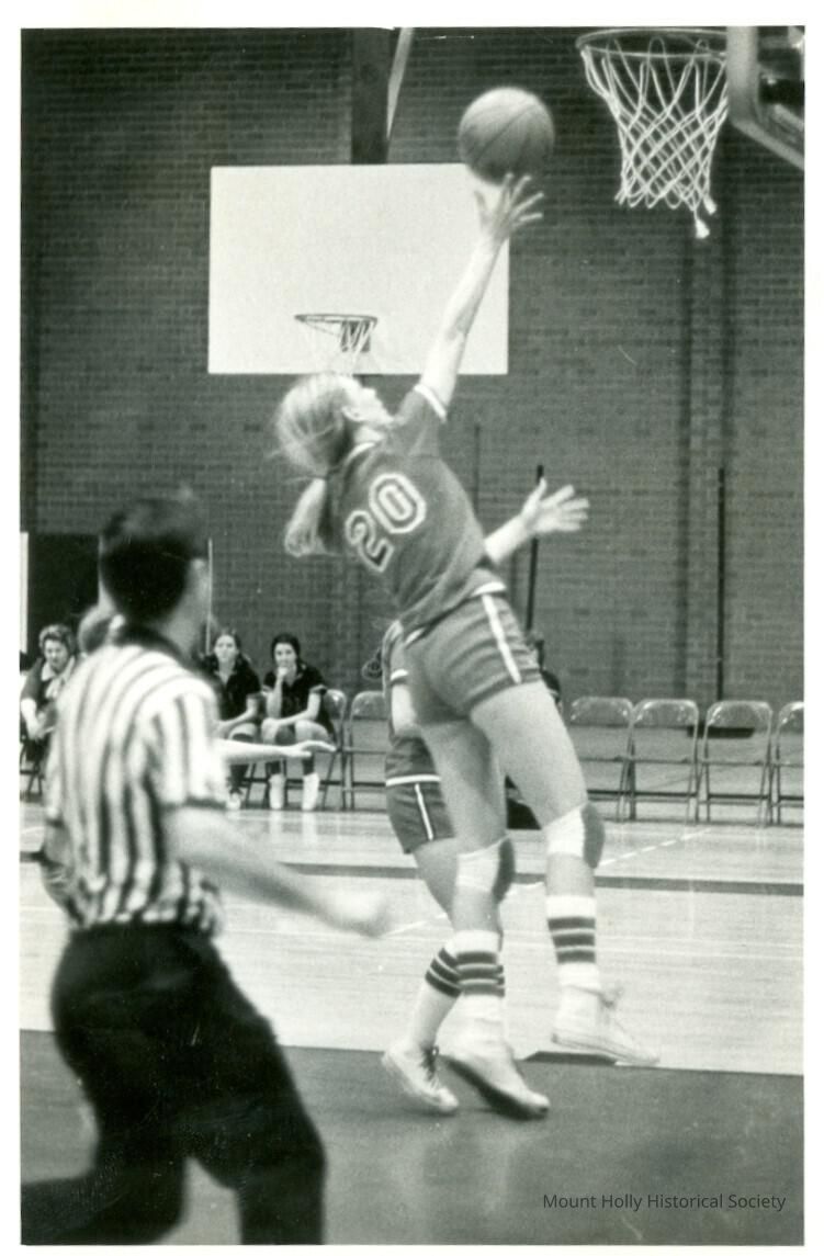 "Where's Everybody?": Two female basketball players under net, one leaping up to score, while the referee watches and others watch from the sidelines
