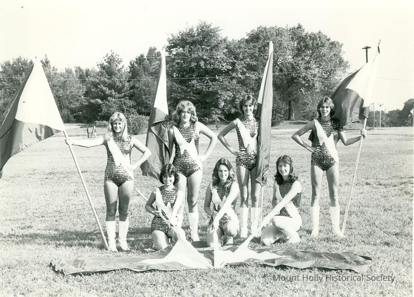 East Gaston Flag Girls: Seven young women with flags, four standing, three kneeling in front with flags lowered