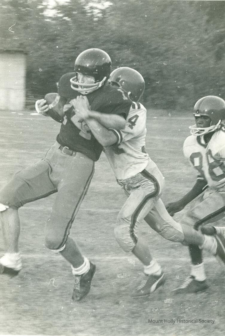 "Stop Pushing": Three football players in game, one with ball, a second seizing him from behind, and a third running up