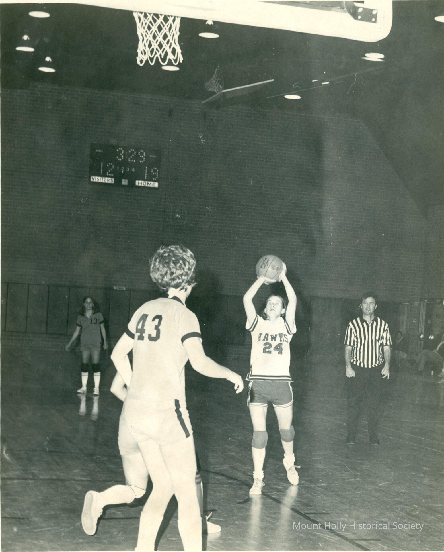 "Long Way to Basket": Female basketball player aims for net while another player (back to camera) runs up to her
