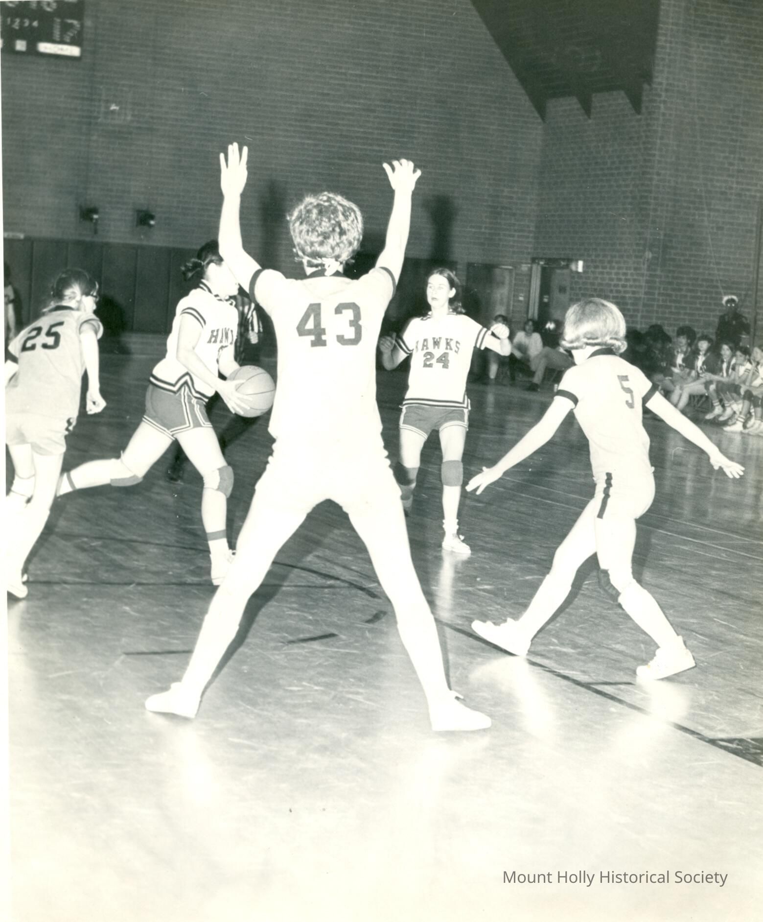 Five female basketball players during game; one with back to camera and the other four in a semicircle before her, with one dribbling the ball