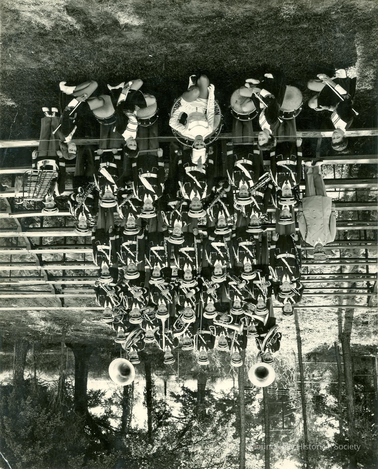 Marching band, dressed in uniforms, posing on bleachers outdoors with majorettes kneeling in front
