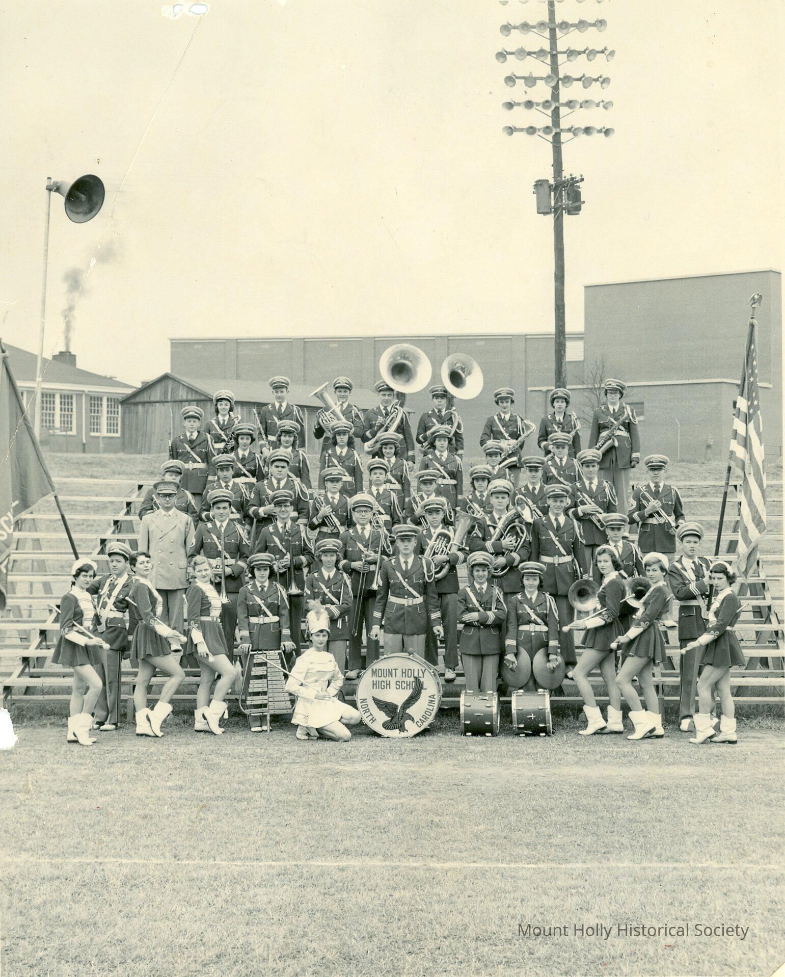 Mt. Holly High School marching band in uniforms, posing on bleachers outdoors with majorettes standing in front