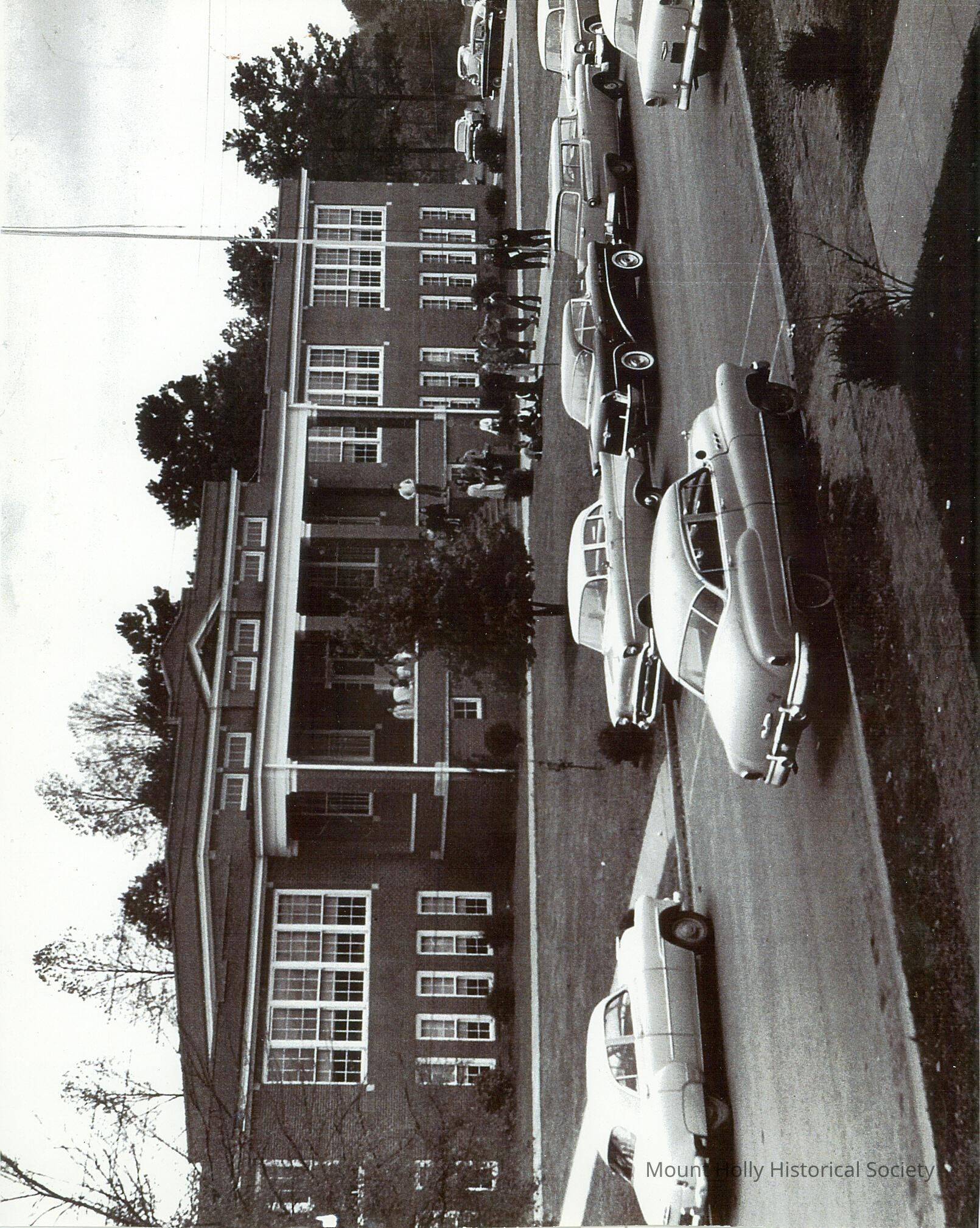 Exterior of large building, with some people on sidewalk and cars parked on the street