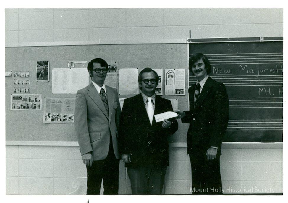 Mr. Black standing in classroom with two other men, with Mr. Black holding a check