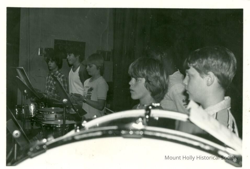 Close-up photo of drum section, practicing inside bandroom (maybe junior high students)