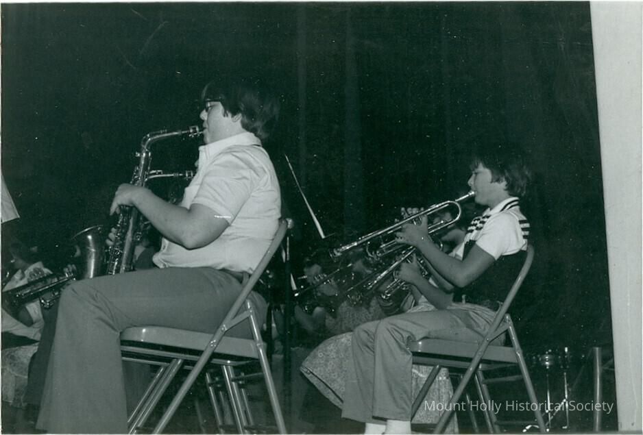 Saxophone and trumpet players, performing on stage of auditorium with photo taken from close to the stage (photo by Dianne Ellis)