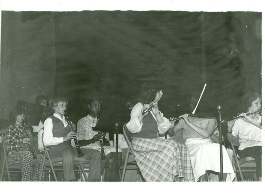 Mt. Holly Junior High flute and clarinet players performing on stage in auditorium (photo by Dianne Ellis)