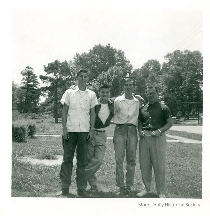 Calvin, Ralph, Bummie, and Bob: Four white men standing outside in a grassy area