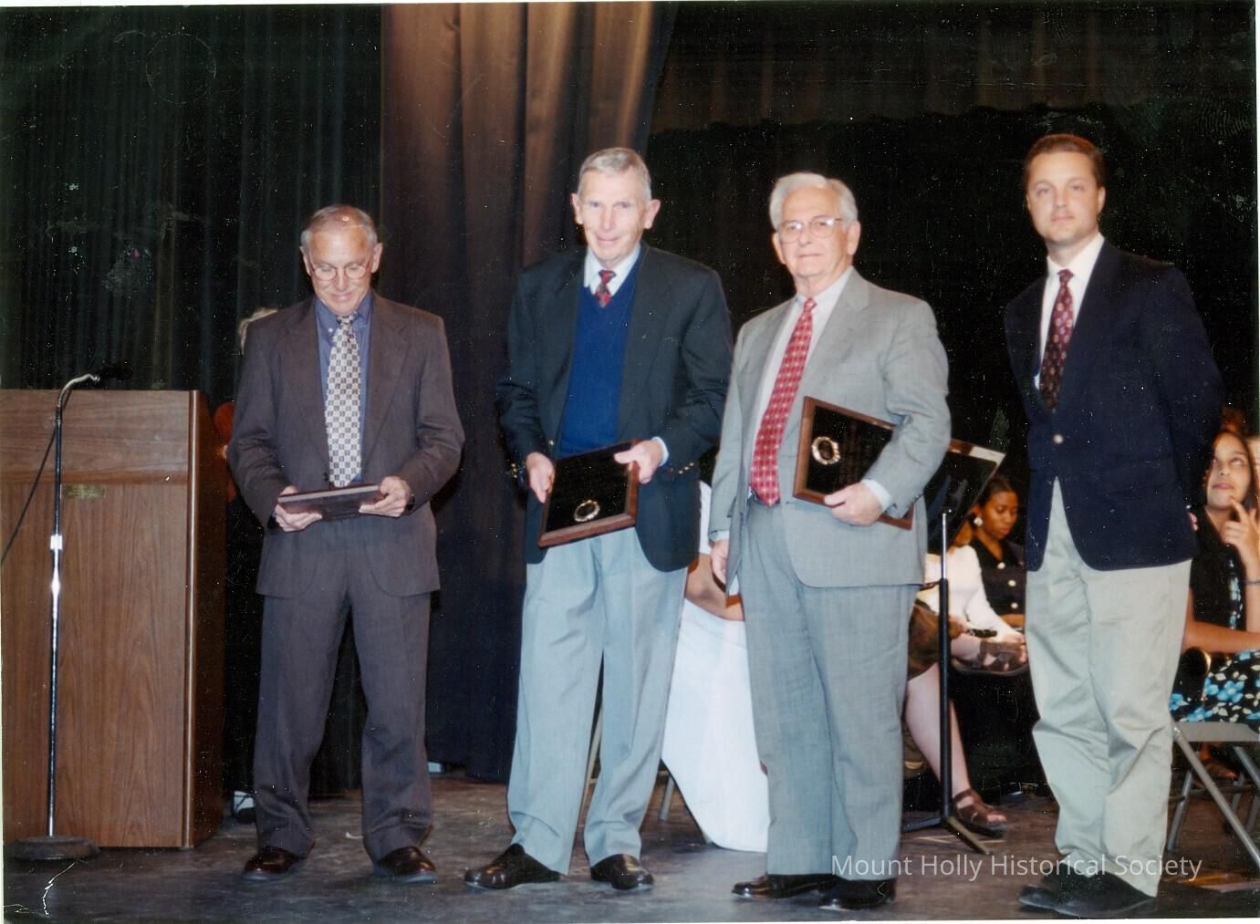 Three elderly and one younger white man on stage in suits, with the elderly men holding plaques