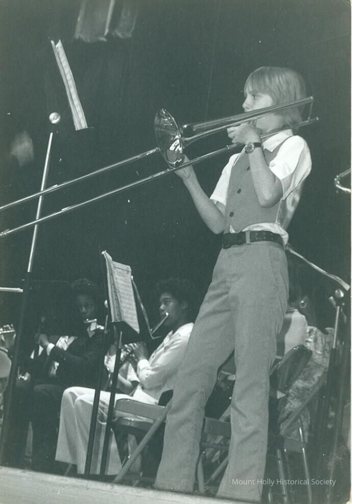 Young trombonist performing solo on stage while other members are seated behind him (all dressed formally)