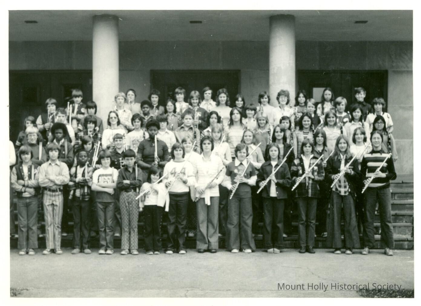 Band members arrayed on steps of auditorium with instruments but without uniforms