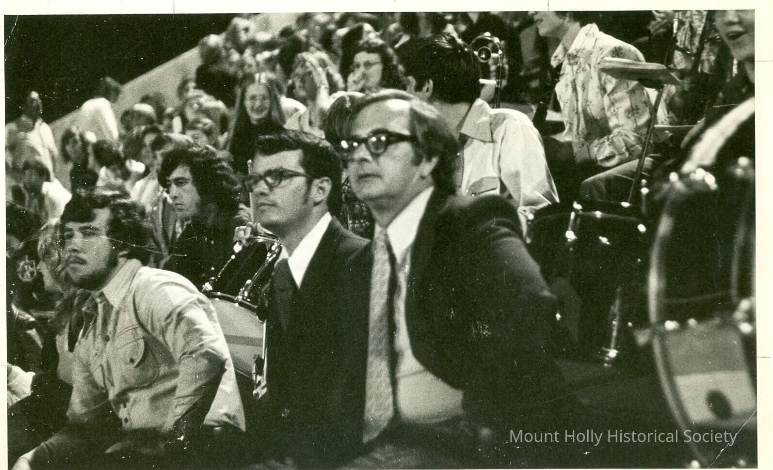 Band director seated in stands with many others, watching game at night