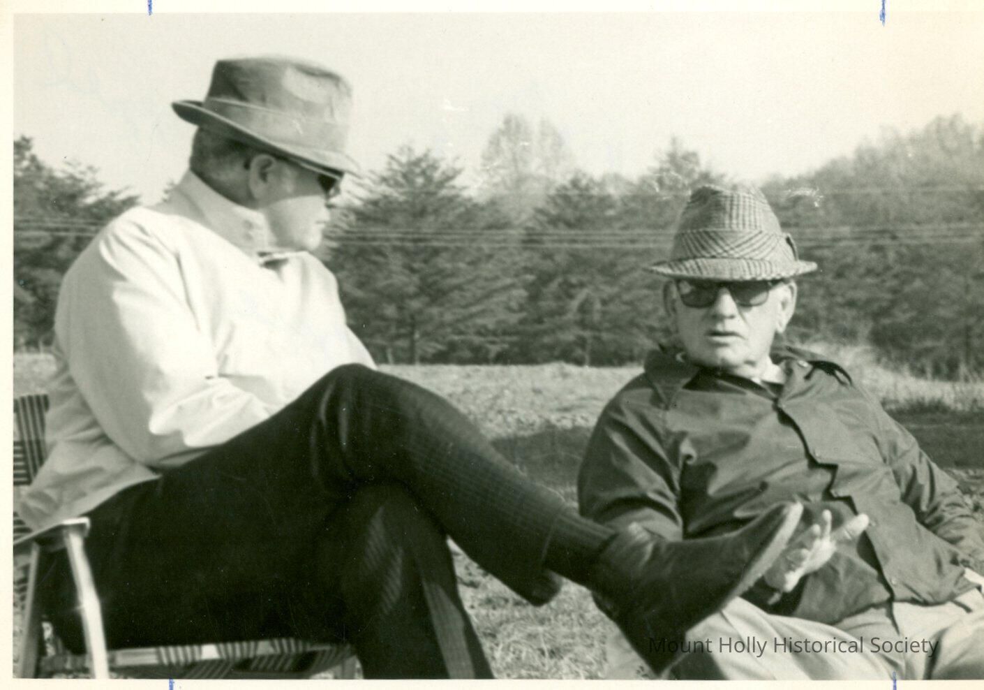 "Major League Scouts": Two older men in jackets, seated outside, speaking to each other