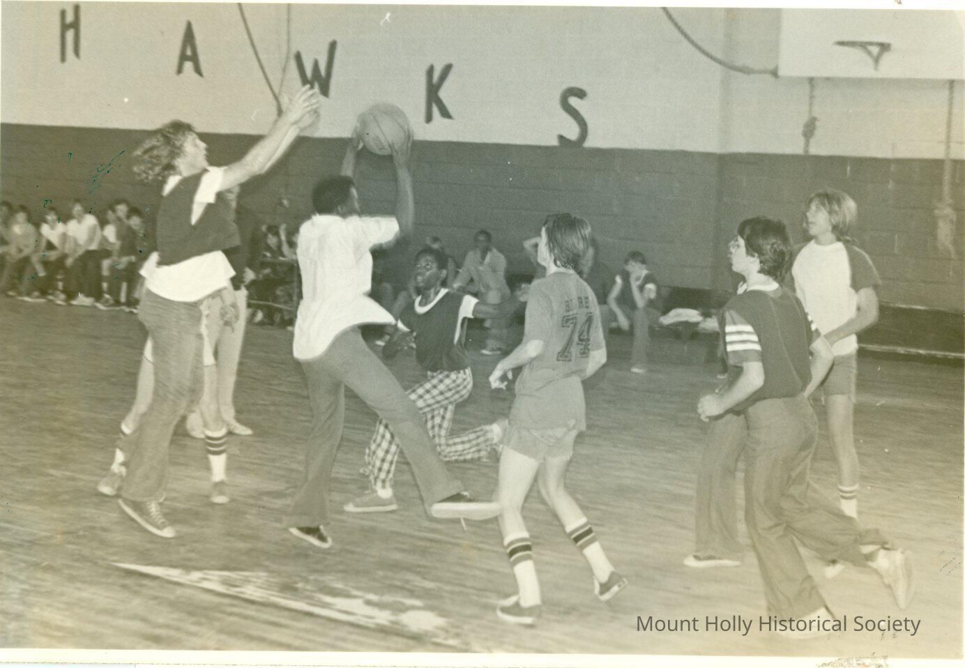 "Action in the A": Seven young male basketball players (black and white) struggle for basketball as other students watch on sidelines