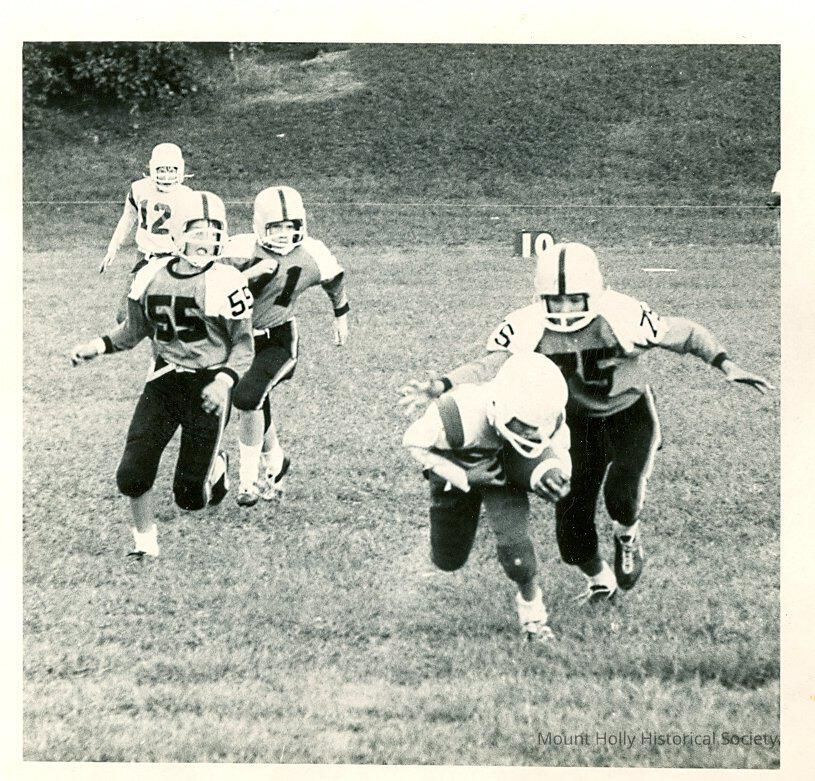 "GOTCHA!" Six young boys playing football, one with the ball as a second prepares to tackle him