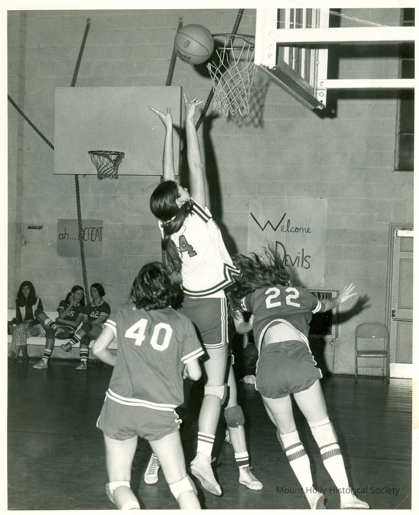 One female basketball player leaps up under the net as two others are at her feet, while other players watch from sidelines