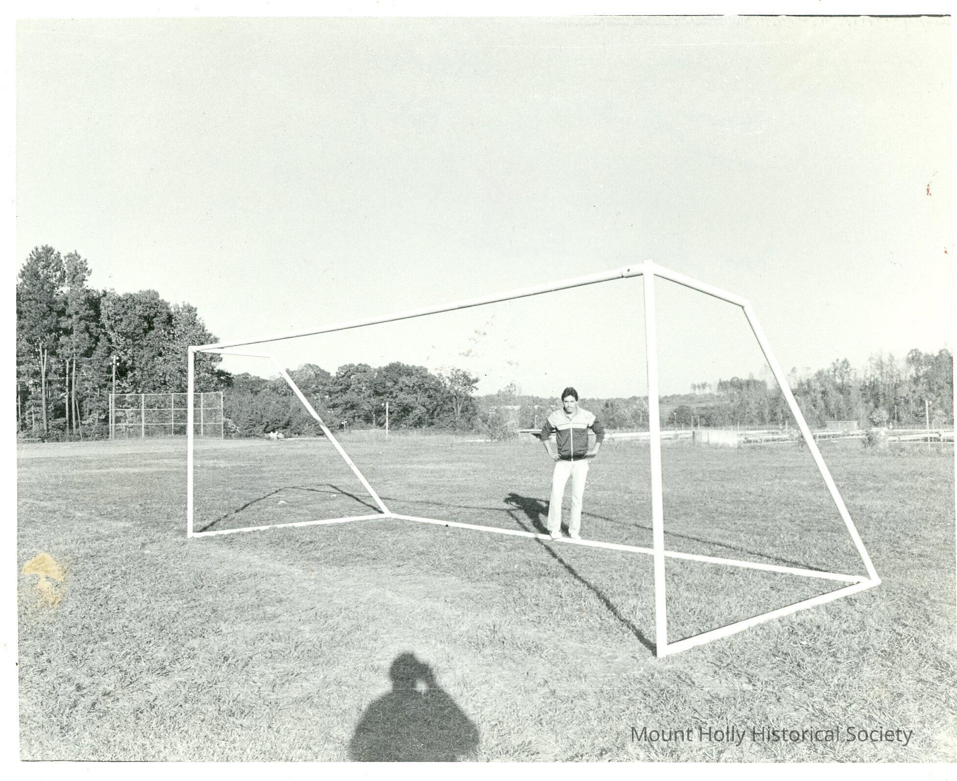 "New Soccer Goals": Young man stands within frame of a soccer goal without a net