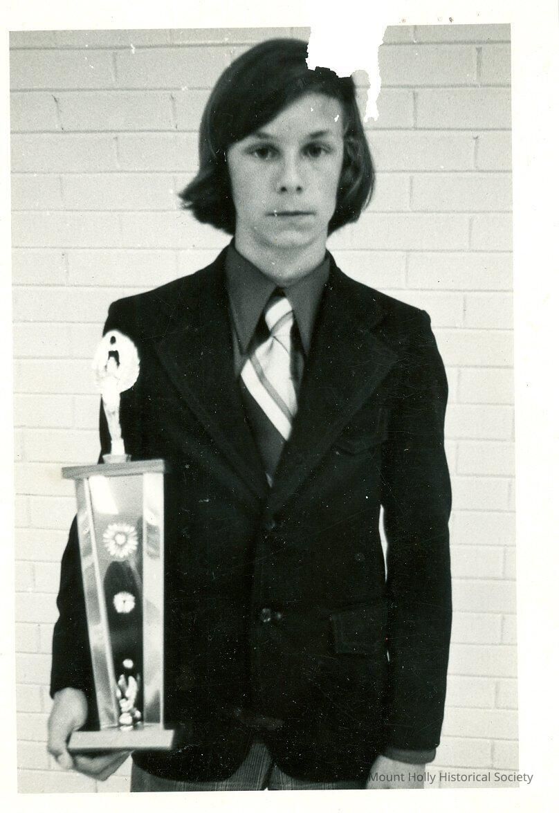 "Warrior Wrestler": Young man in dark suit, facing camera and holding trophy