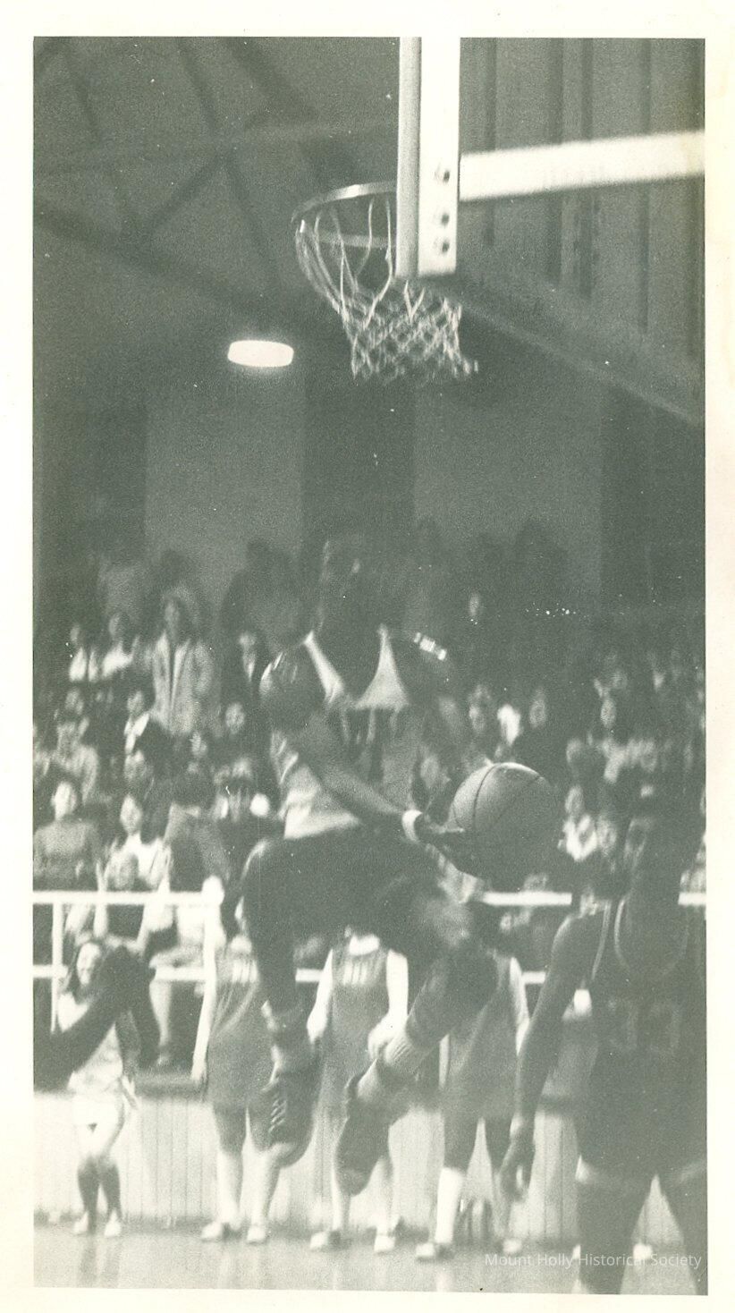 Male basketball player jumping up with ball underneath net as fans in stands look on