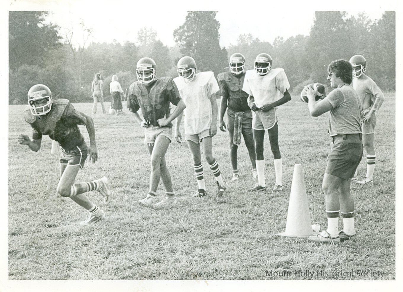 "With the Receivers": Five football players in single-file line with a coach with a ball to his side, about to throw it (photo by Scott Griffin)