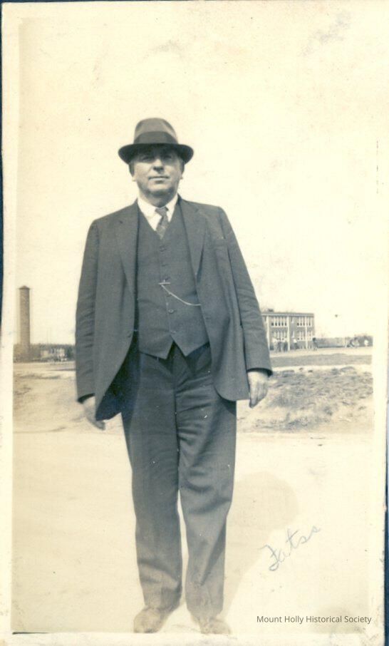 Man in three-piece suit with hat and keychain, standing in an open area, with "Fatso" inscribed on the picture