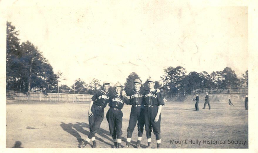 Four men in baseball uniforms on field, with arms around their shoulders; on the photo's back is written "C. Hayes, J. Carpenter, G. Lawing, C. Williams"