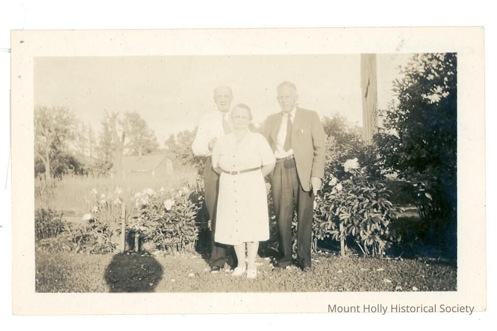 Three older white people (two men, one woman) standing outside in a garden. From back of photo: "Herbert, Louie & Mack"