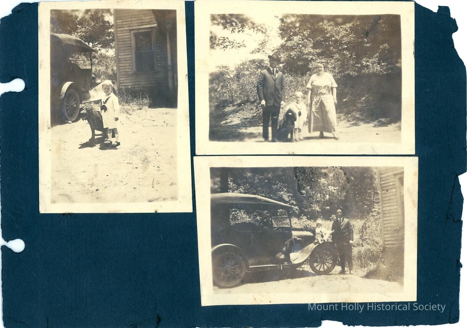 Three photos on black paper. Top left: young boy with dog; top right: man and woman with same boy and dog; bottom; man, boy, and dog on car