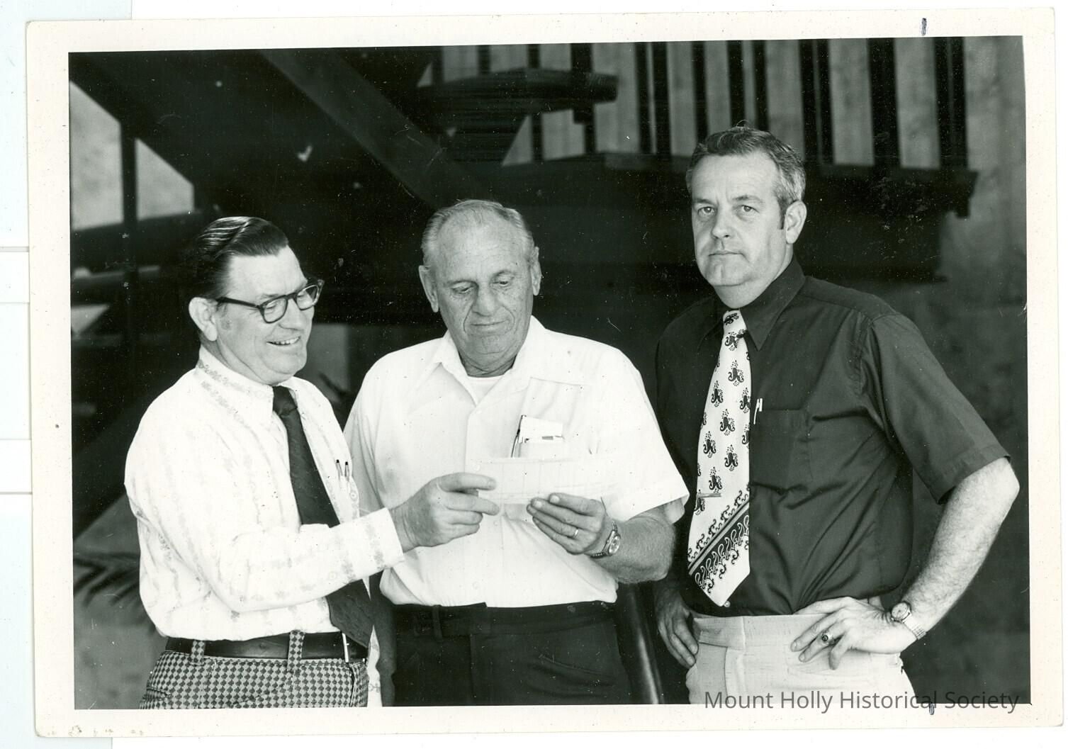 Three middle-aged white men, two holding and looking at a check, while the third looks at the camera. From back: "Employees Donate"