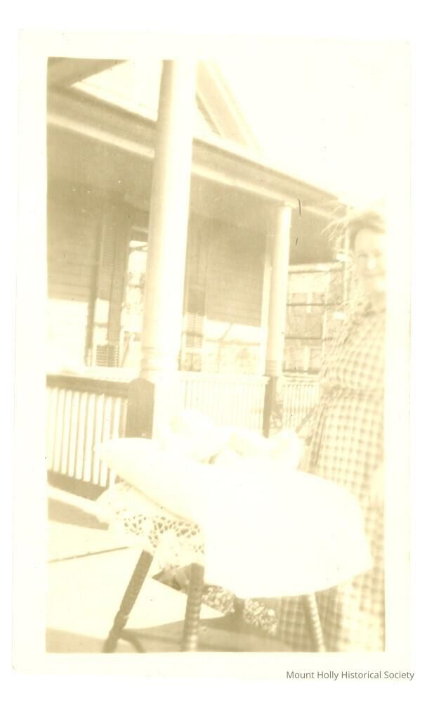 Infant on pillow on chair outside on porch with woman standing beside. From back: "Charles Anderson when baby"