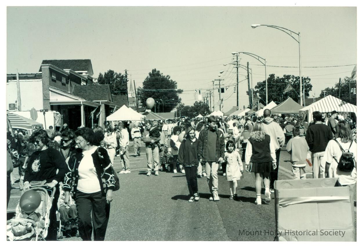 Many people walking up and down street during a celebration of some sort; from back of photo "Stanley."