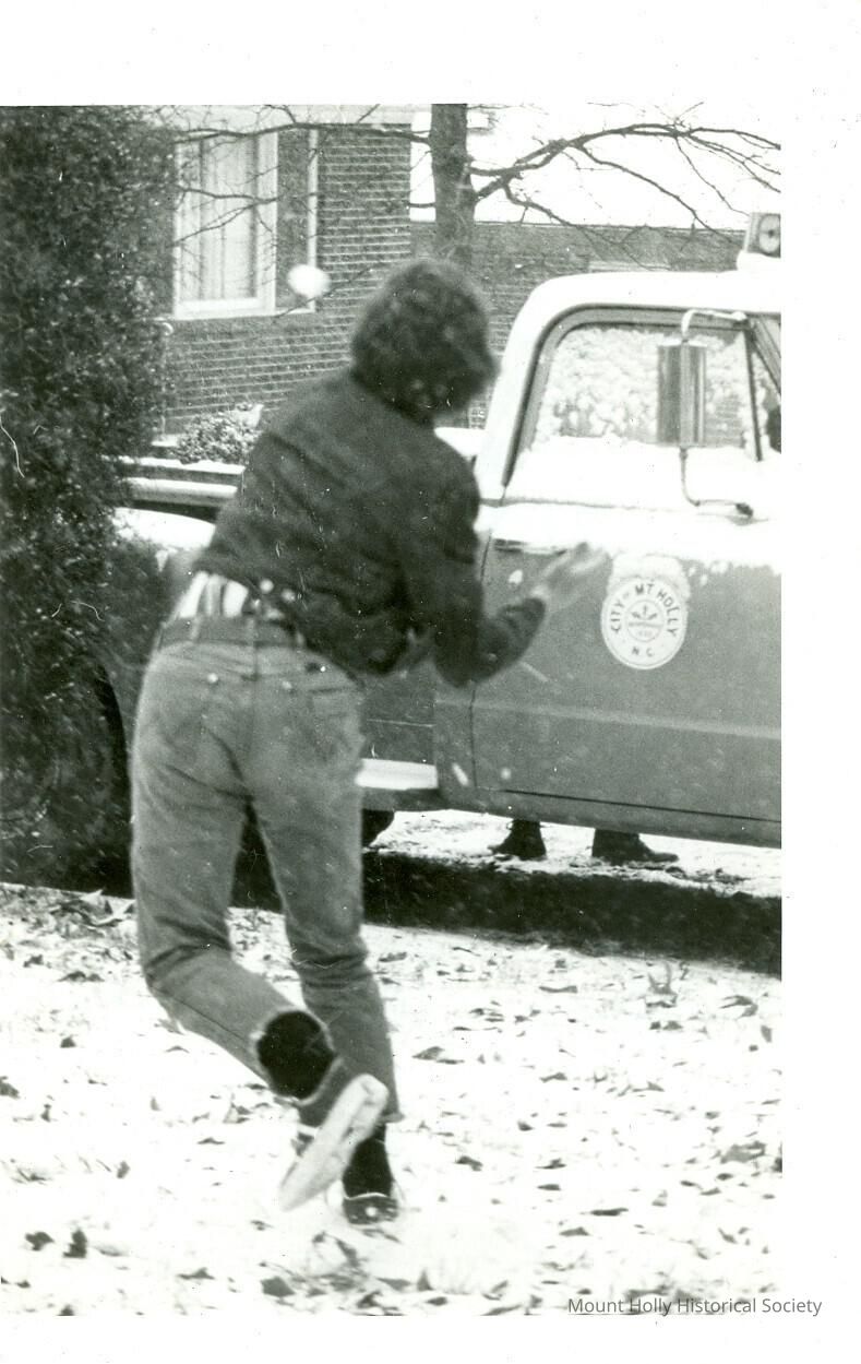 Young man (back to camera) hurling snowball over parked truck, with a person behind it; from back "Come Out, Chicken"