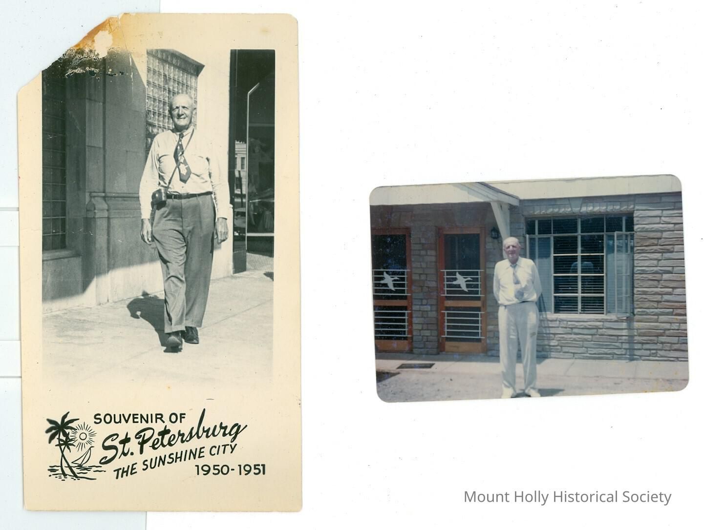Two photos of Herbert Graham, one in front of a building, one walking down sidewalk in St. Petersburg, Fla., with camera